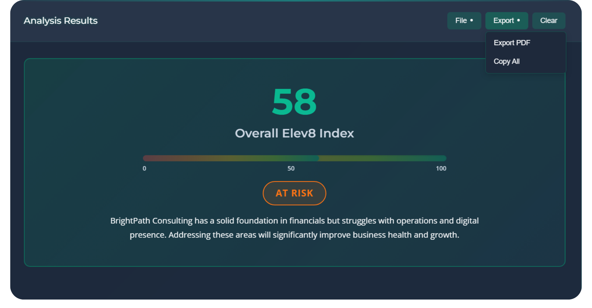 Yes, you can export a branded, timestamped PDF copy of your Elev8 Report for your records or to share with partners or advisors.