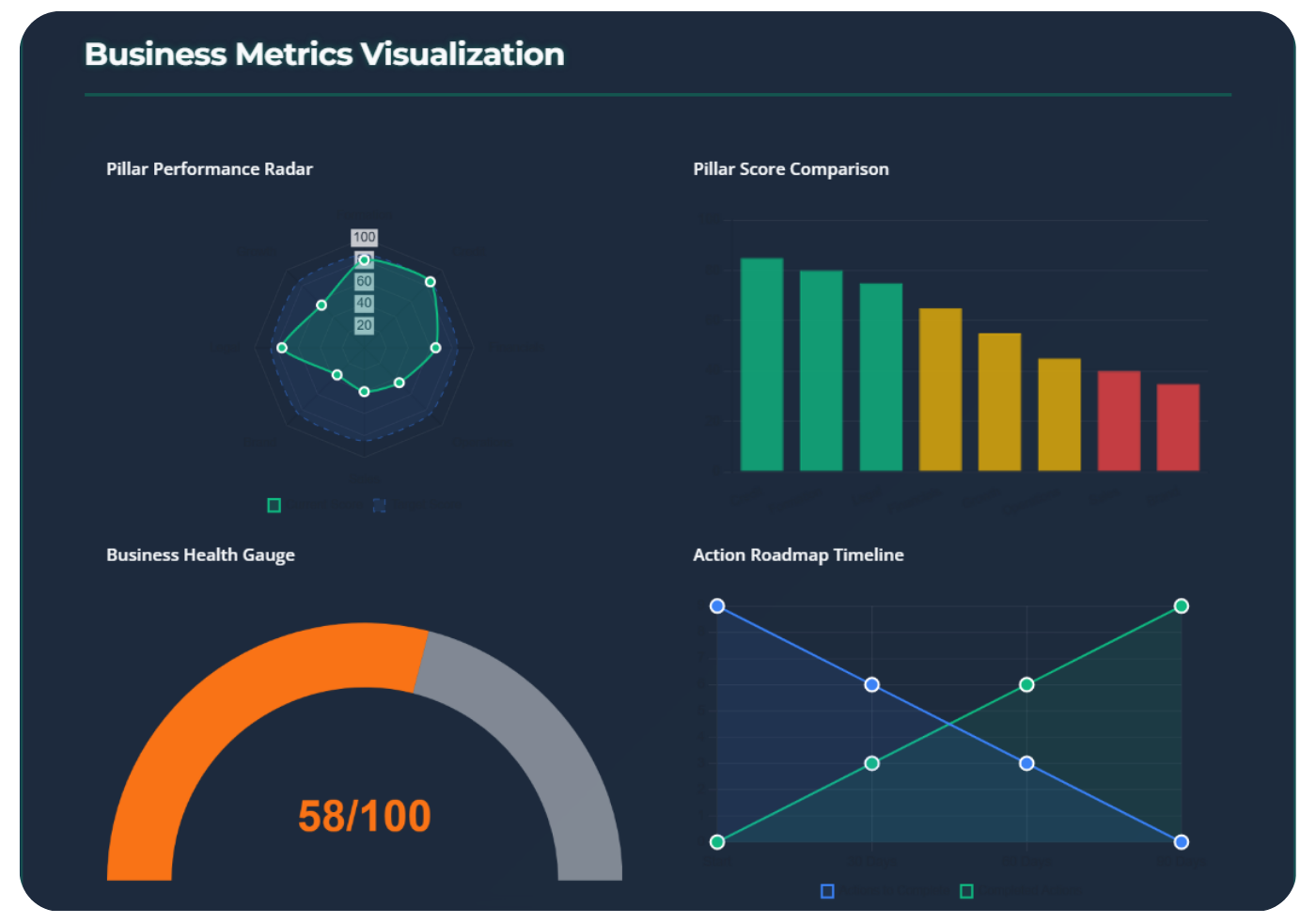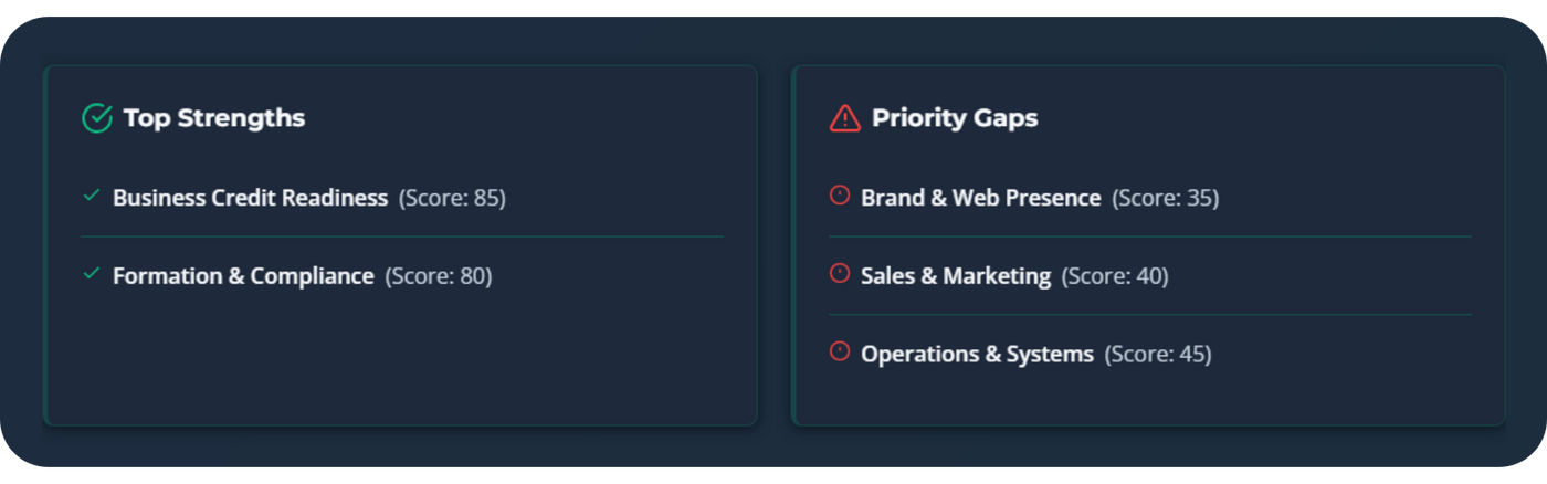 Evaluates structure, credit, operations, brand, and compliance to reveal your true business readiness.