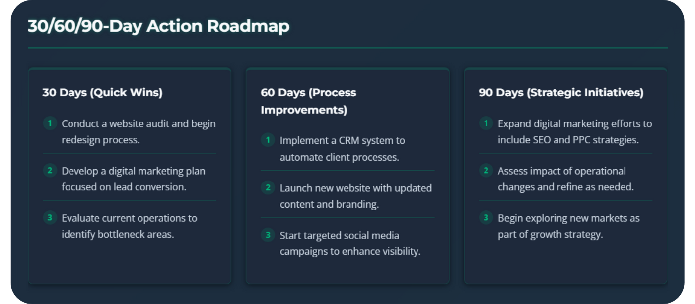 You’ll receive a personalized Elev8 Report showing your overall score, pillar-by-pillar breakdown, and a 30/60/90-day action roadmap.