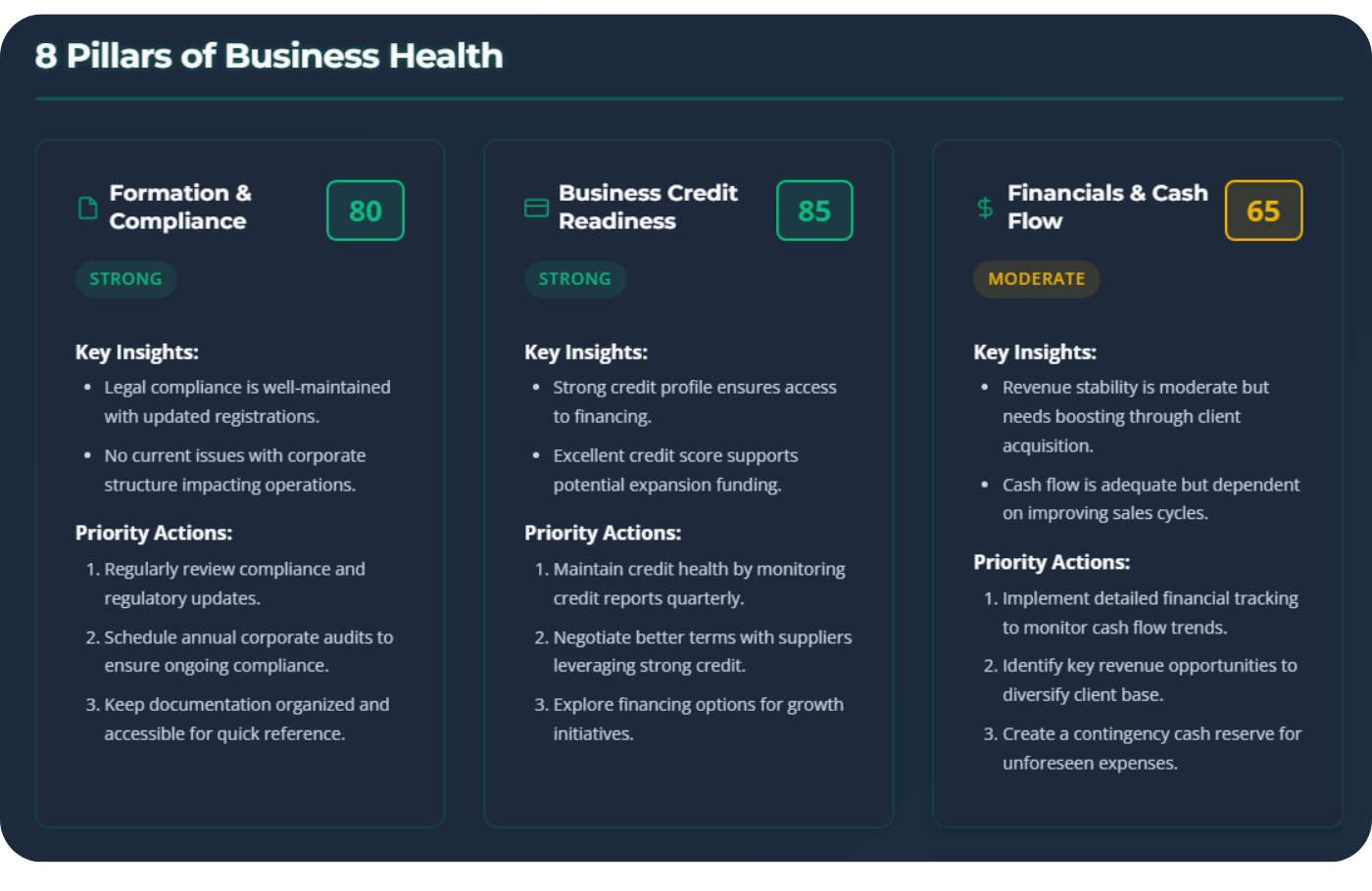 Get clear, actionable steps to improve each pillar and raise your overall business readiness.